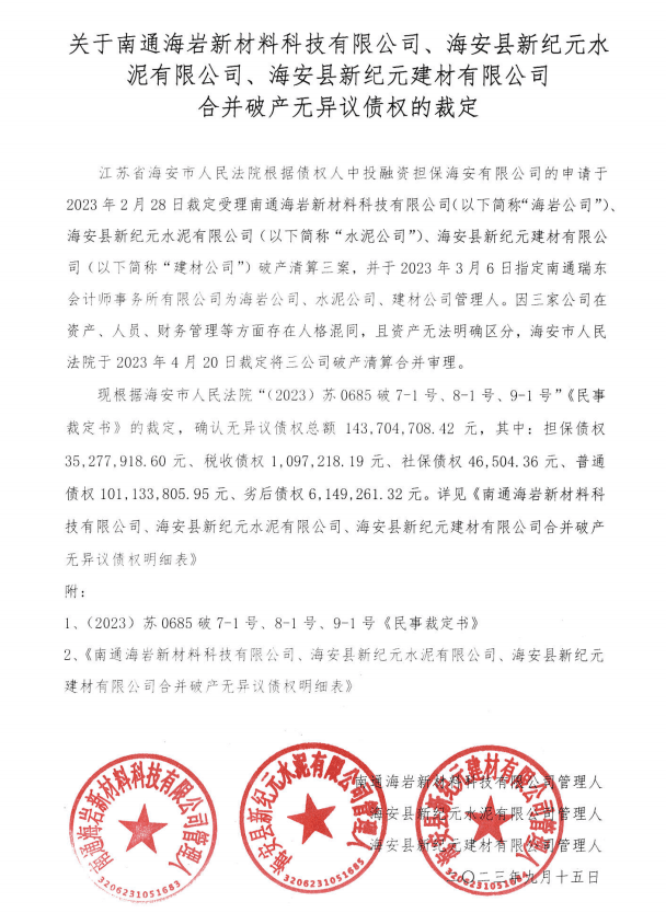 江蘇省海安市人民法院根據債權人中投融資擔保海安有限公司的申請,于2023年2月28日裁定受理南通海巖新材料科技有限公司、海安縣新紀元水泥有限公司、海安縣新紀元建材有限公司破產清算三案,并于2023年3月6日指定南通瑞東會計師事務所有限公司為海巖公司、新紀元水泥公司、建材公司管理人。因三家公司在資產、人員、財務管理等方面存在人格混同,且資產無法明確區分,海安市人民法院于2023年4月20日裁定將三公司破產清算合并審理。