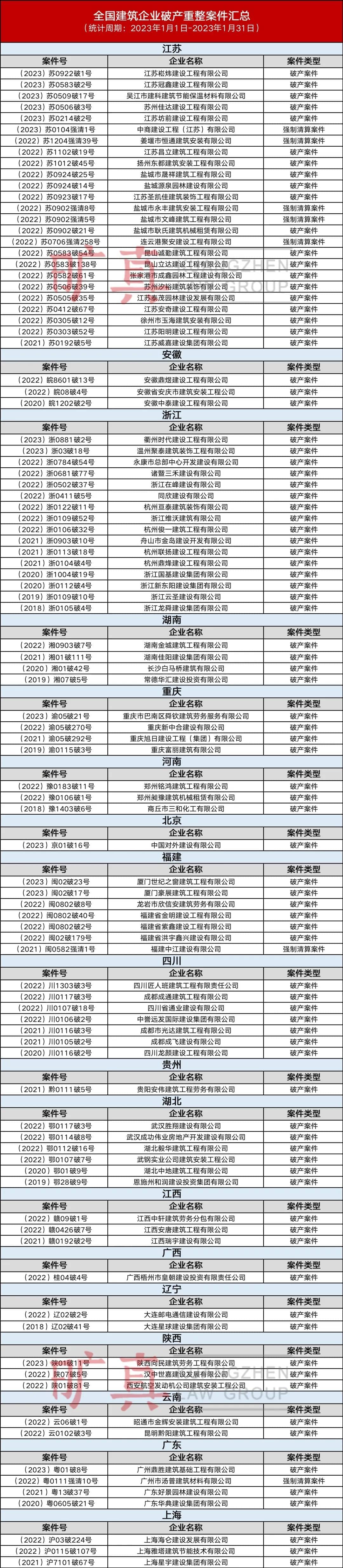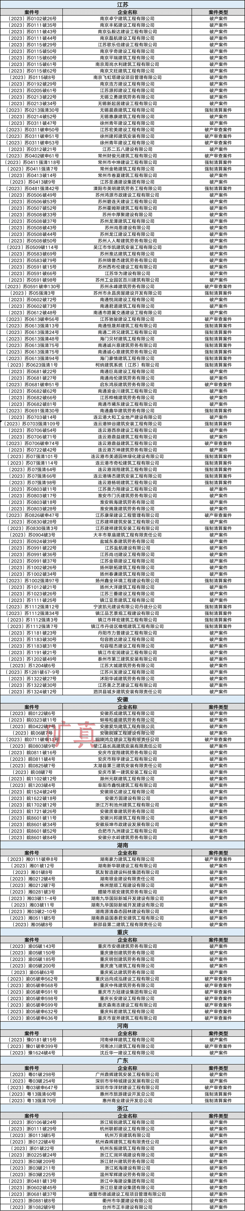 從2023年1-8月全國建筑企業破產重整案件匯總名單(見附件)可見,占比較大的仍是江蘇省。一位項目經理介紹稱,老家江蘇,一個縣就有好幾家特級總承包。而今這些“特級”也都已經入列破產名單了,這些破產公司的員工絕大多數都回鄉了。