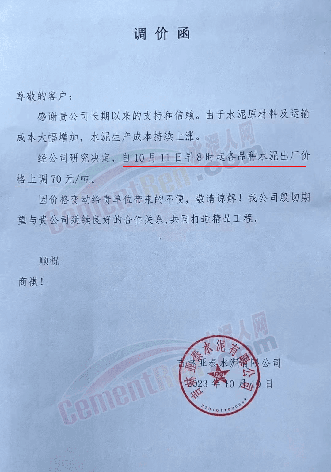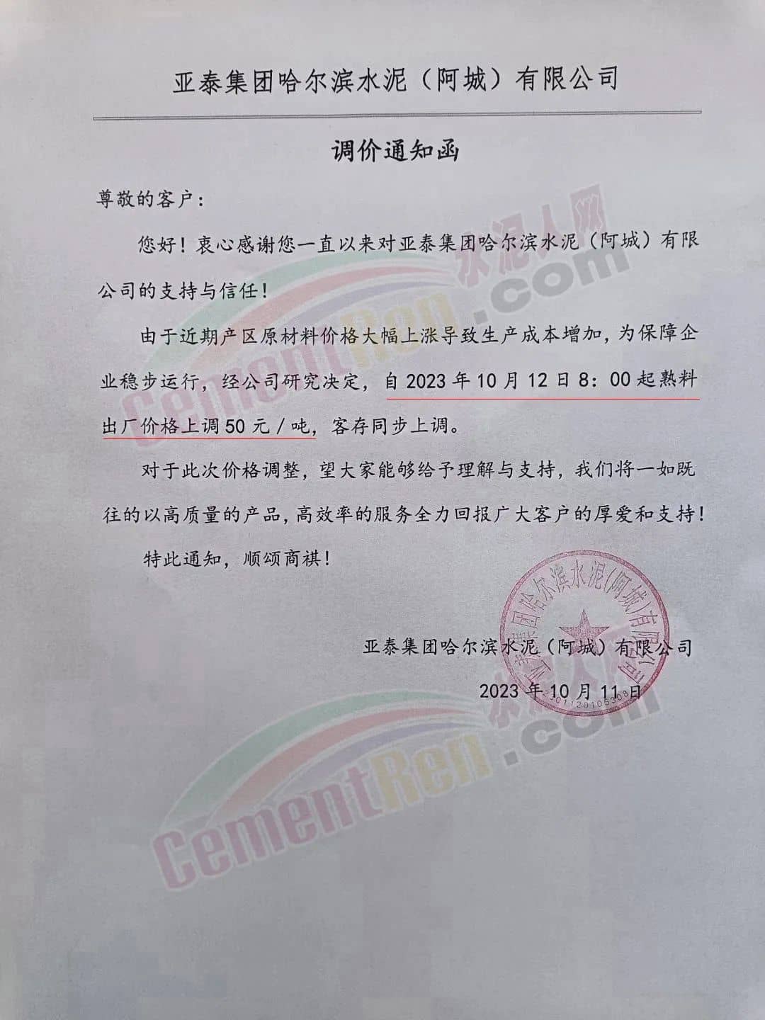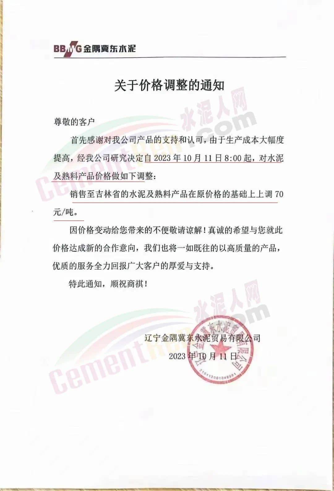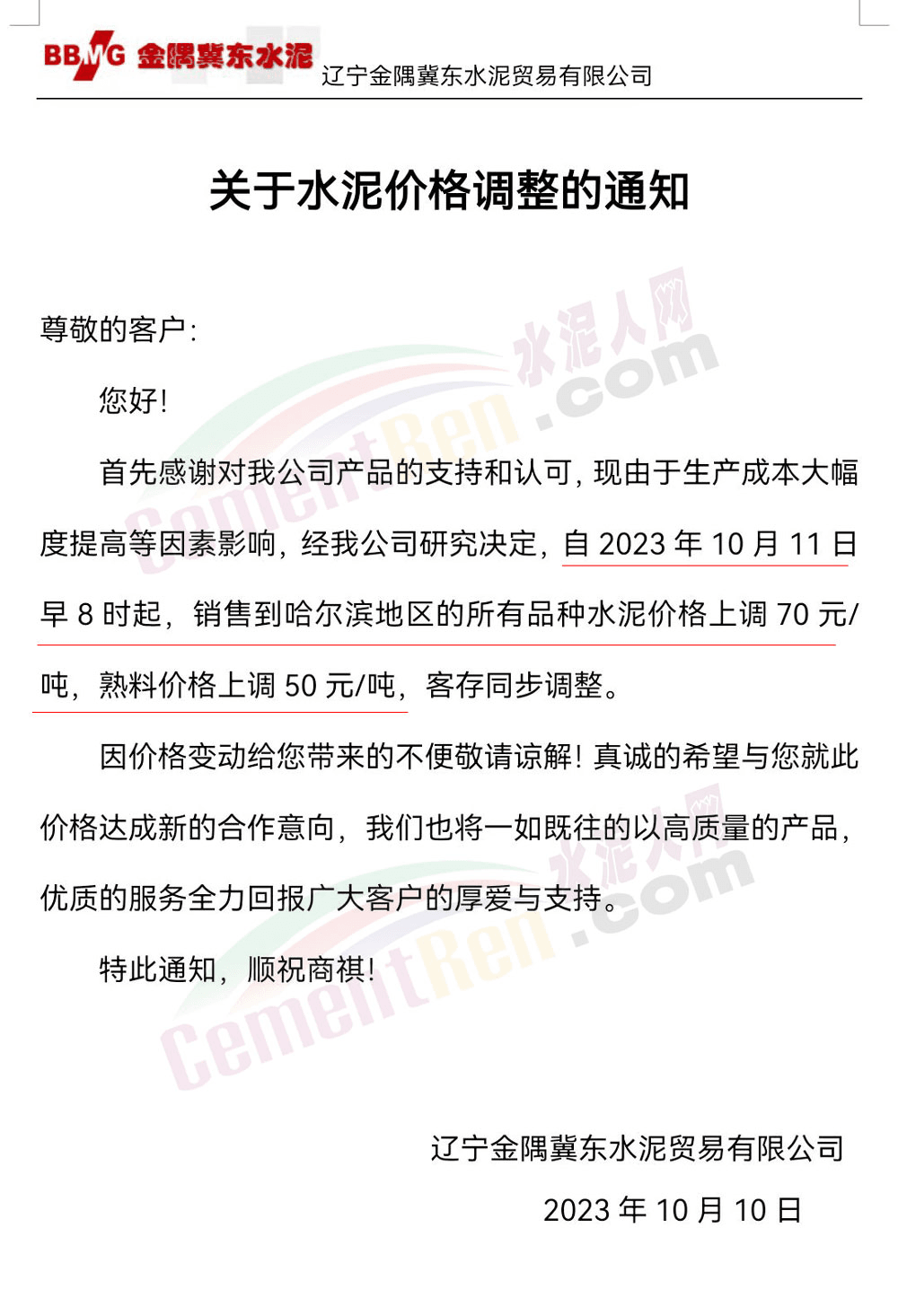 黑龍江區域主要品牌企業亞泰水泥、北方水泥以及遼寧金隅冀東發往黑龍江區域的水泥、熟料報價上調50-70元/噸。