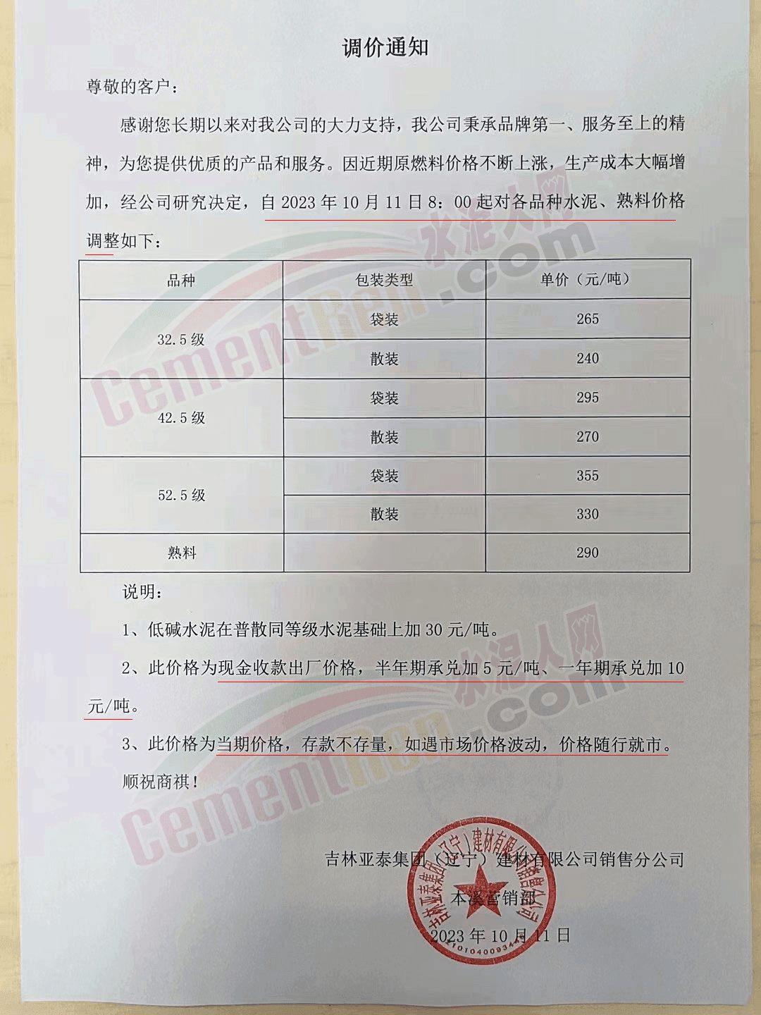吉林區域,亞泰、北方、金隅冀東等企業通知上調水泥、熟料價格50-70元/噸。