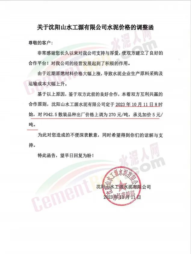 遼寧區域,吉林亞泰集團(遼寧)建材有限公司銷售分公司、天瑞水泥、山水工源、臺泥、銀盛、恒威、大伙房水泥等也通知調整水泥報價。調整后42.5級散裝水泥報價270元/噸,52.5散裝水泥報價330元/噸,熟料報價290~300元/噸。