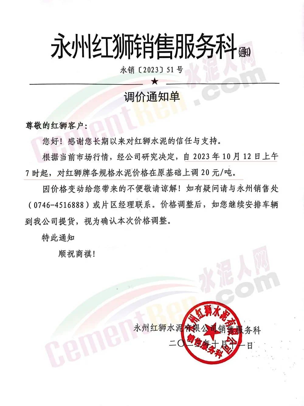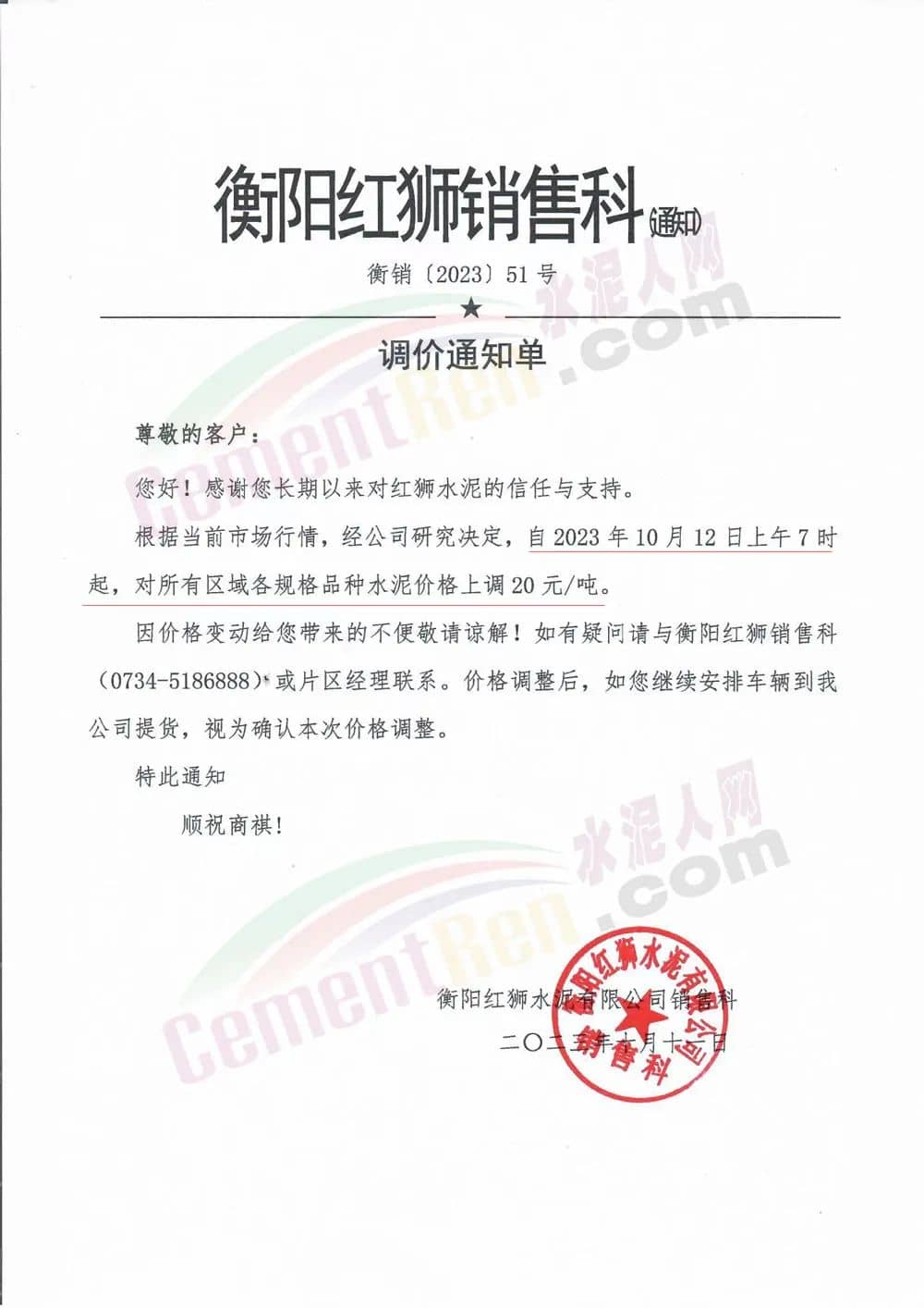 同日湖南區域主要品牌企業通知12日起再次上調水泥價格20元/噸。