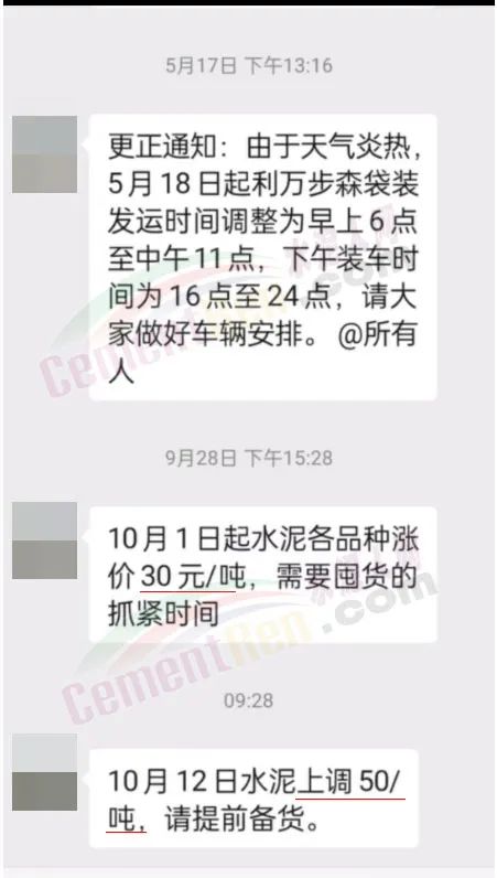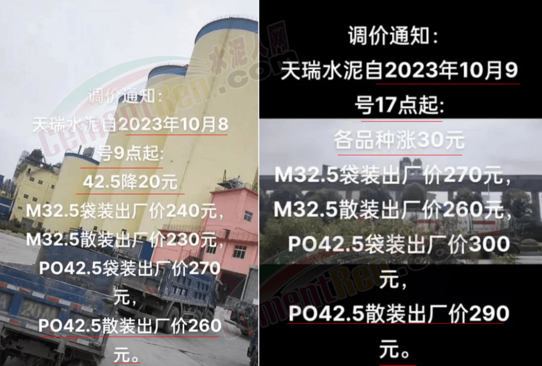 日前,河南地區主要品牌企業天瑞、中聯同力等通知上調報價30元/噸。當地經銷商反饋稱:企業通知10月8日9點降價20元/噸,降后P.O42.5散裝水泥出廠報價260元/噸;10月9日17點又通知上調30元/噸,上調后P.O42.5散裝水泥出廠價報290元/噸。變價像“川劇變臉”一樣快。