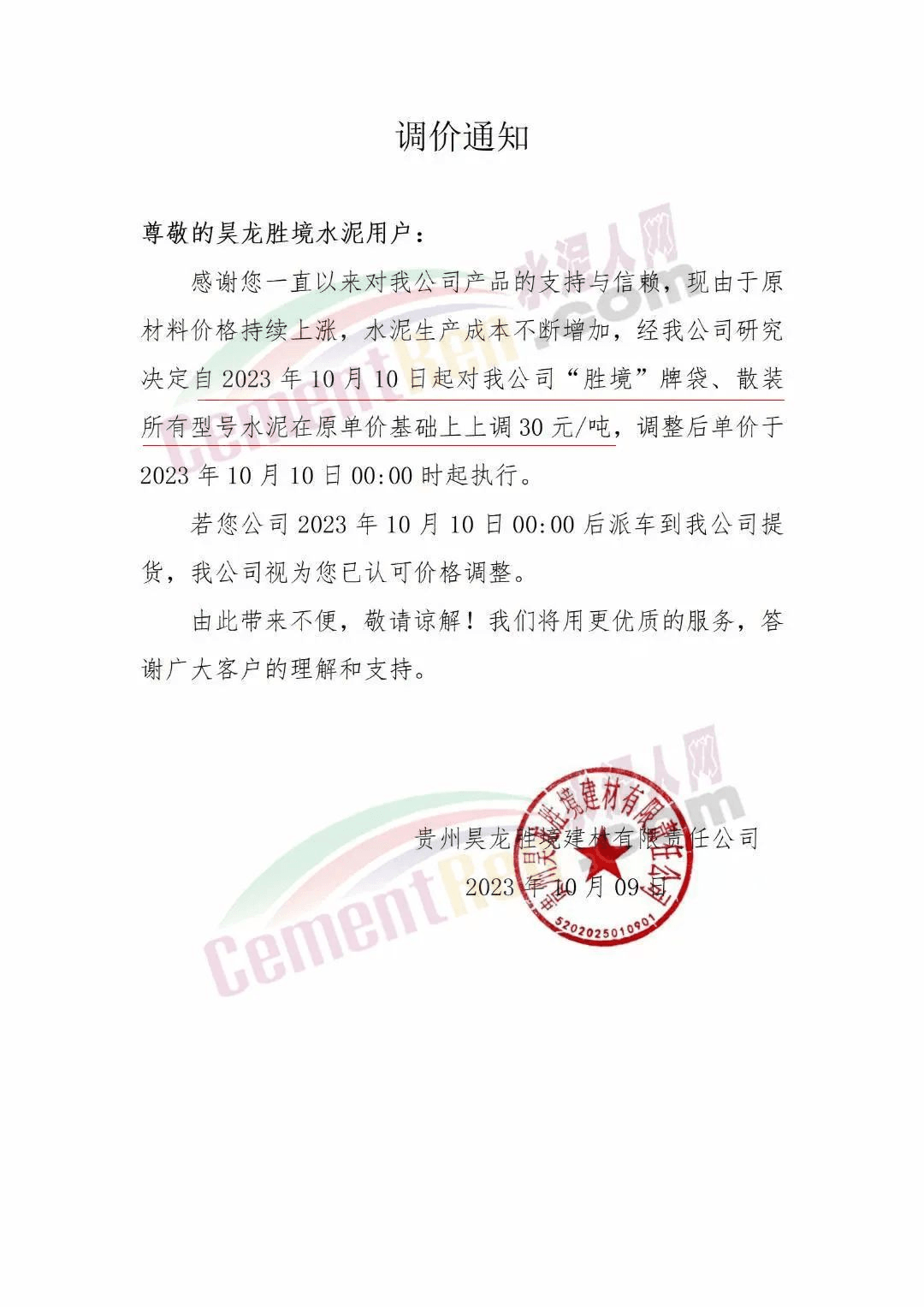 貴州區域多家企業通知上調水泥報價30元/噸。