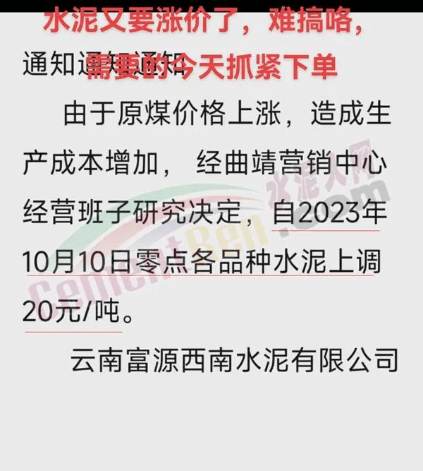 四川區域主要品牌水泥企業銷售經理通知,將于12日起上調水泥報價50元/噸。