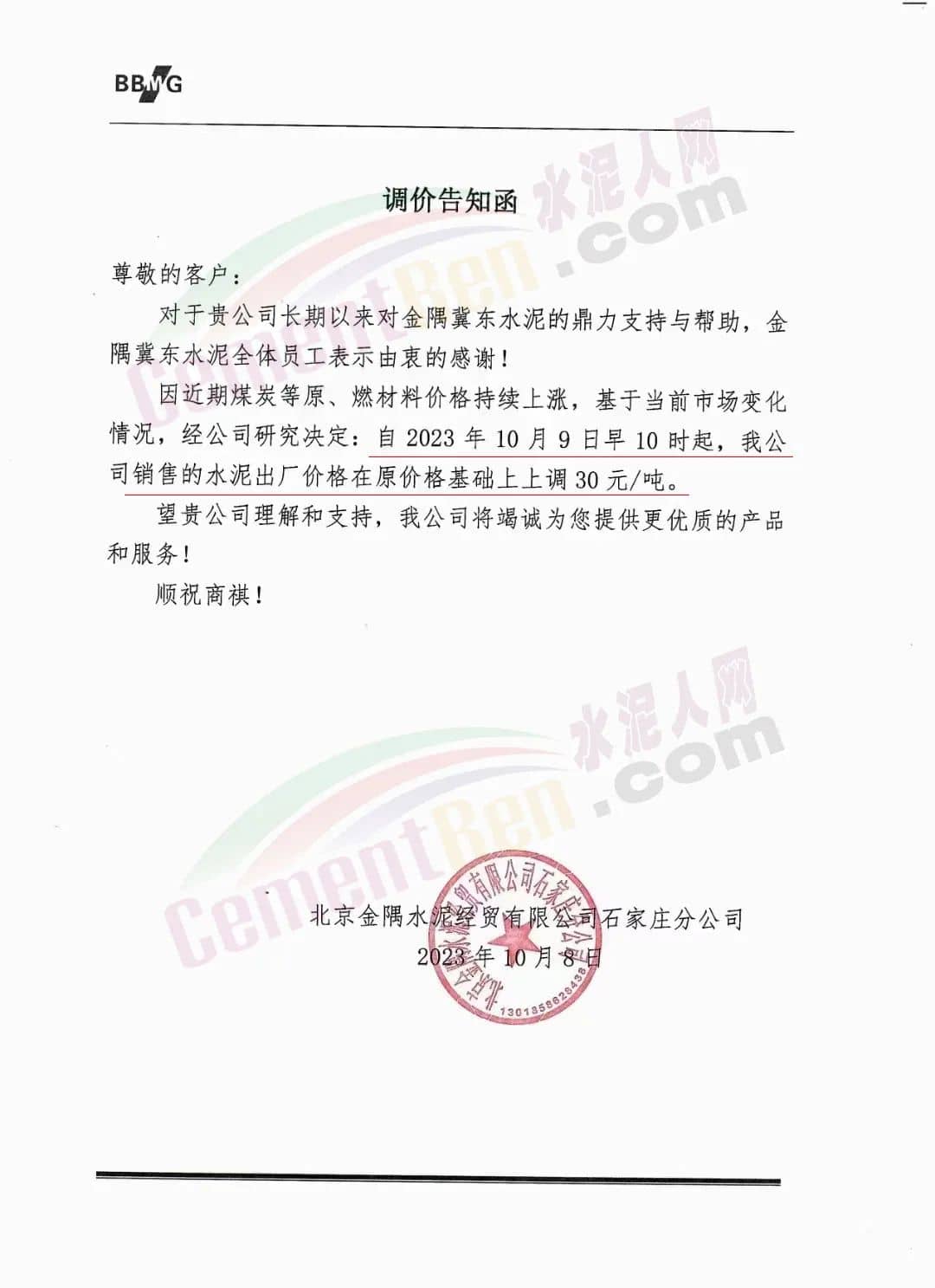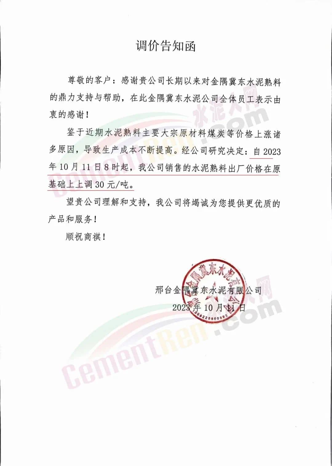 京津冀地區,北京金隅水泥石家莊分公司、邢臺金隅冀東水泥有限公司、邢臺金隅詠寧水泥有限公司等主要品牌企業通知上調水泥、熟料報價30元/噸。