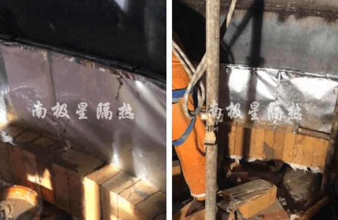 施工中,35mm納米隔熱板分兩層施工,一層25mm粘貼于鋼殼上,然后施工10mm的隔熱氈,兩層隔熱板錯縫施工。采用35mm納米隔熱板代替100mm的硅酸鈣板,內部直徑增加130mm,容積增加了32立方米,外殼溫度由原來的120℃下降到80℃,降溫幅度為40℃,擴容和節能效果明顯,同時50天就收回了投資。