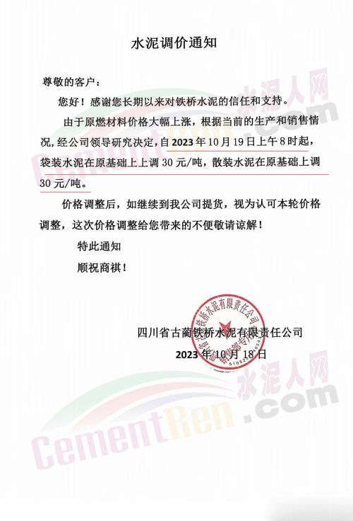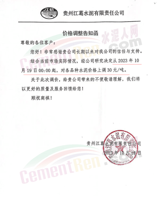 云南省昭通市彝良晨獅建材有限公司通知,根據目前市場形勢和公司生產實際情況,經公司研究決定,從2023年10月21日8時起,對所有區域所有品種水泥價格上調30元/噸。