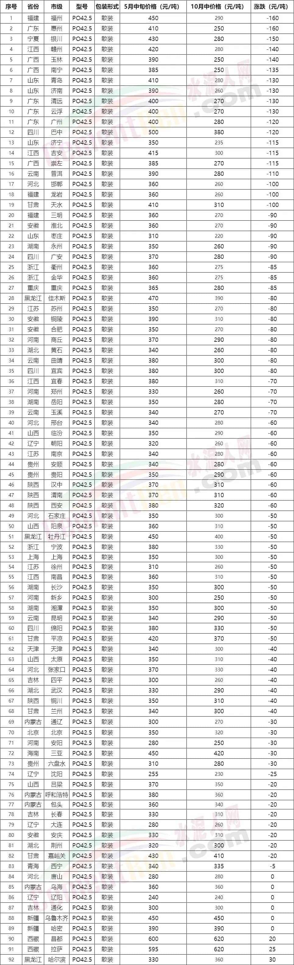 近兩年受房地產行業疲軟的影響,國內很多水泥行業整體效益都不是很好,水泥價格也是一路下跌。從水泥人網信息中心重點監控數據可見,今年下半年以來至部分地區水泥價格不僅沒有上漲,反而下降了100多元/噸。PO42.5水泥價格同比下滑超過100元/噸的地區共有19個,占比達到22%。全國90%以上地區的水泥價格出現了不同程度的下滑,其中福建福州地區水泥價格下滑達到160元/噸,下滑幅度達到35%,廣東惠州地區水泥價格下滑幅度達到了39%,寧夏銀川地區水泥價格下滑34%。