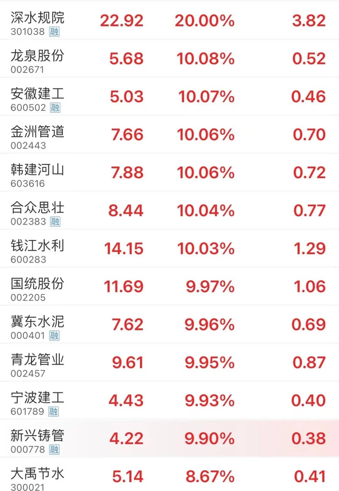 受增發1萬億元國債利好提振,A股聞“基”起舞,水利、水泥制造、基建、工程器械、鋼鐵、建筑等大基建產業鏈全線暴漲。 水利板塊中,深水規院以20%幅度漲停,龍泉股份、安徽建工、金洲管道、韓建河山、合眾思壯、錢江水利、國統股份、冀東水泥、青龍管業等10余只個股漲停。