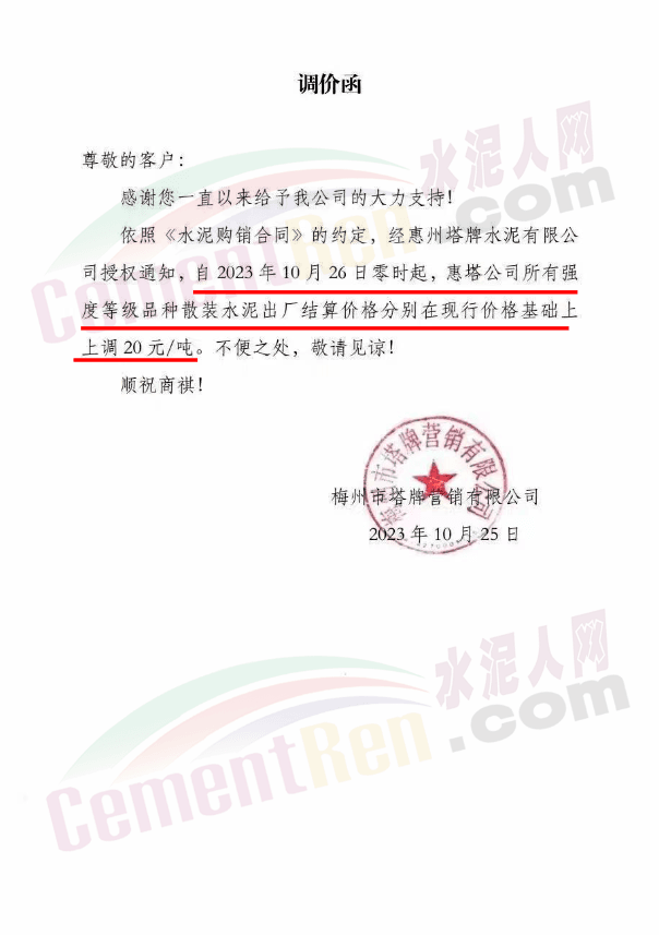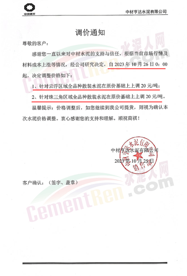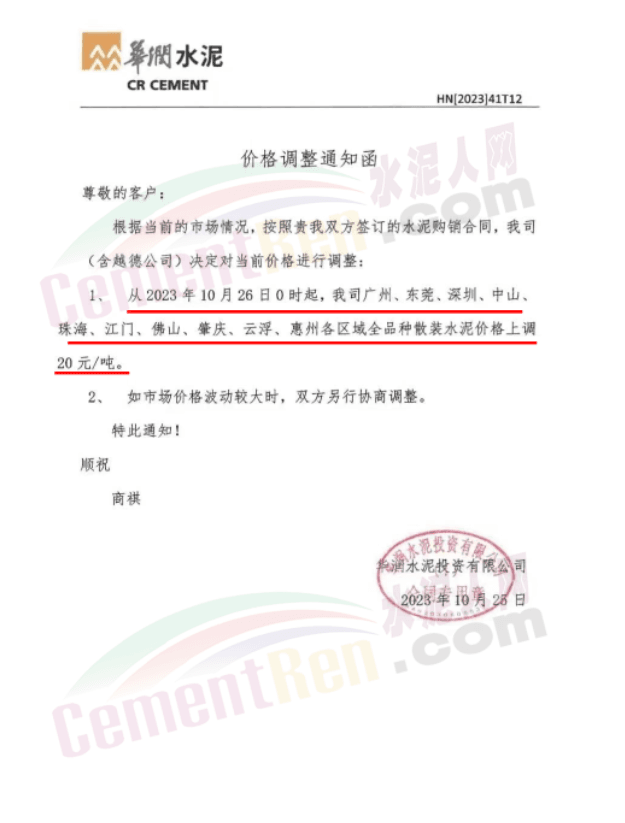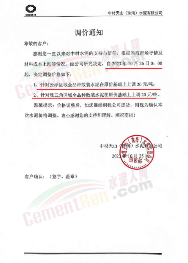 廣東珠三角及周邊區域中材、華潤、塔牌、光大、臺泥等多家主要品牌企業通知自10月26日起上調水泥報價15~20元/噸。