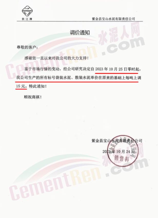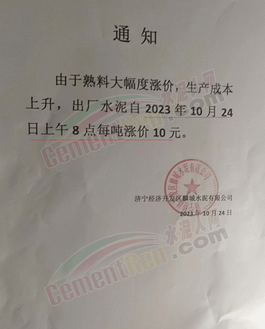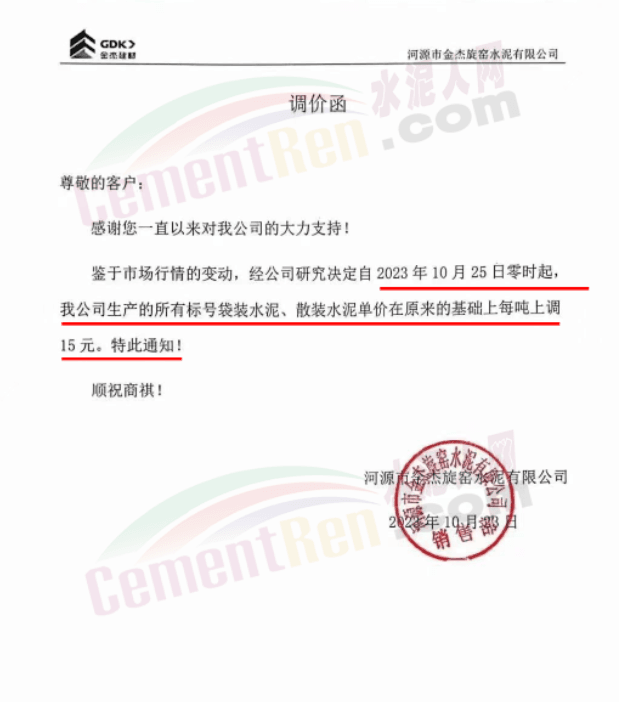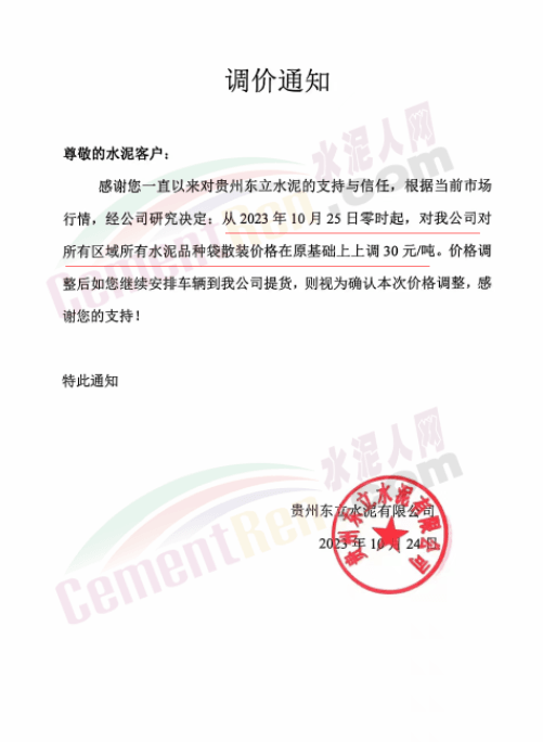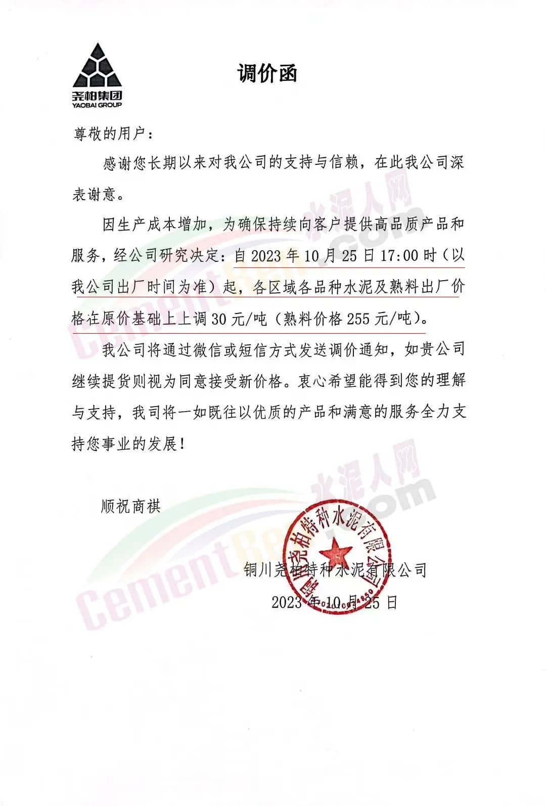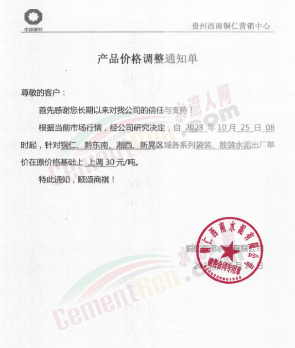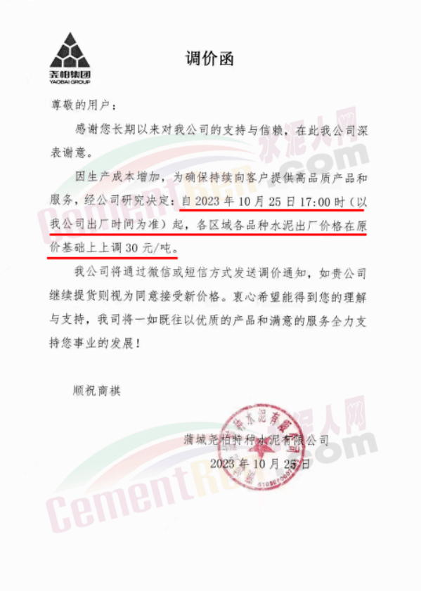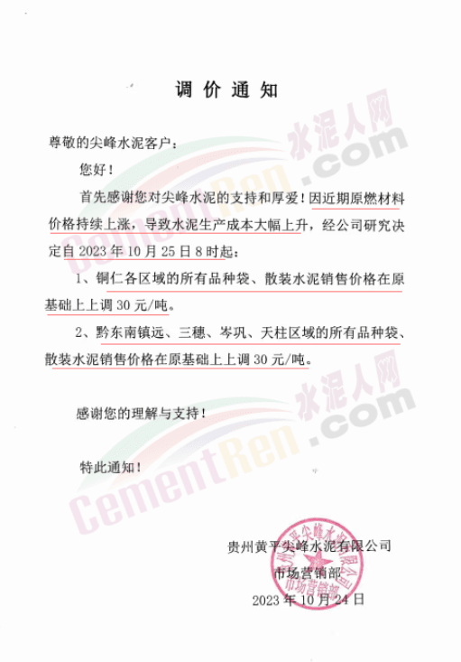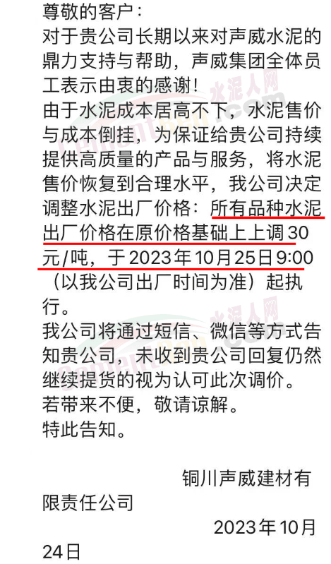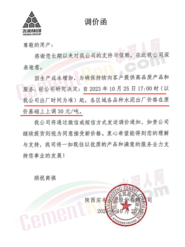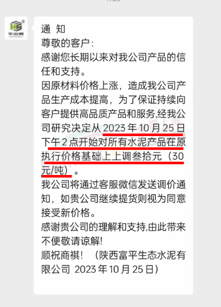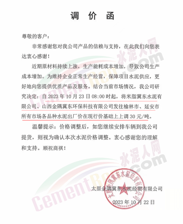 金隅冀東經貿公司通知,由于近期原材料持續上漲,生產能耗成本增加,導致公司生產成本增加。為維持企業正常生產經營,保障項目水泥供應,經研究決定自2023年10月23日8時起,將米脂冀東水泥有限公司、山西金隅冀東環??萍加邢薰景l往榆林市、延安市所有市場各品種水泥出廠價上調30元/噸。