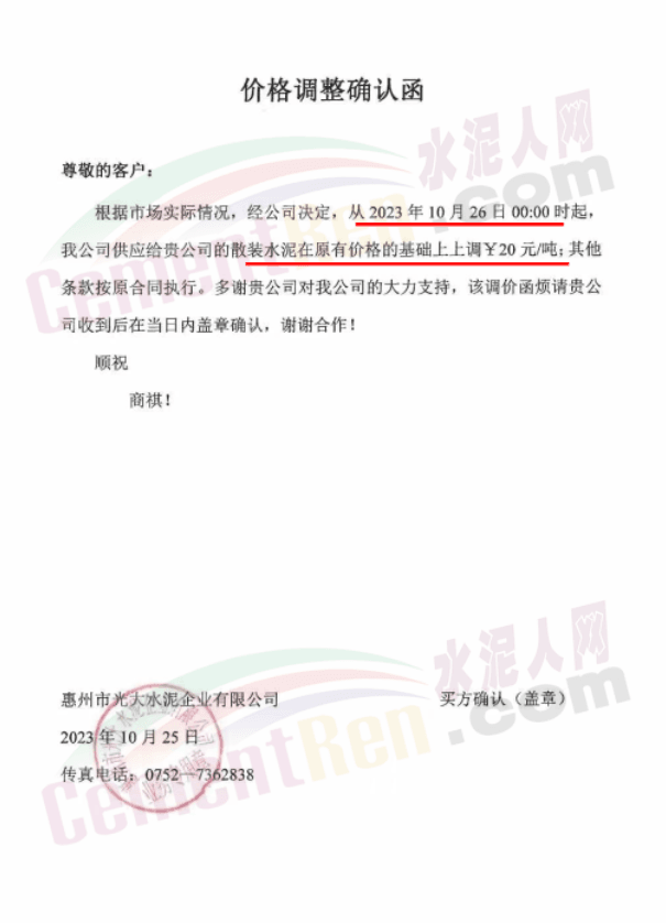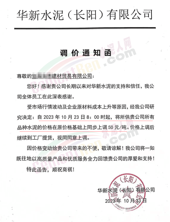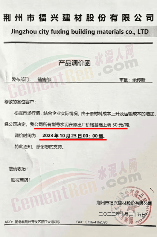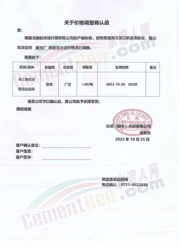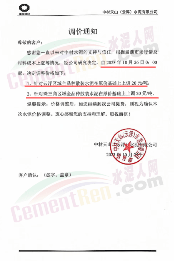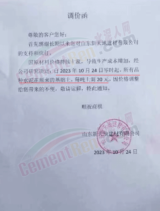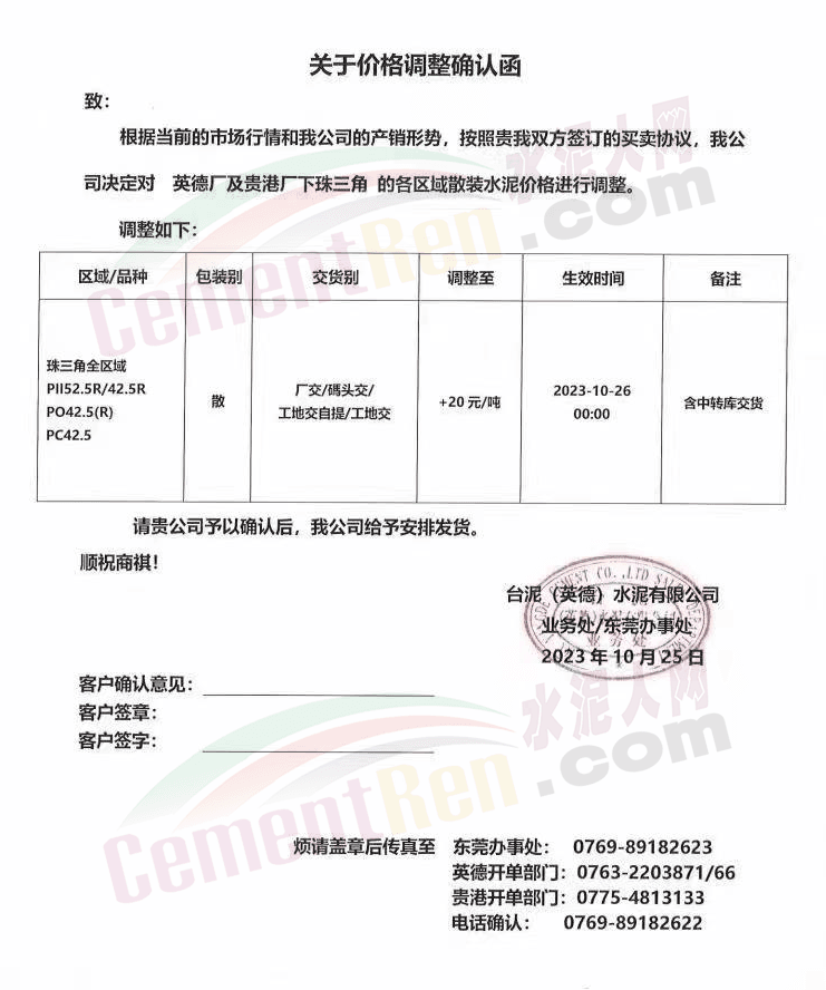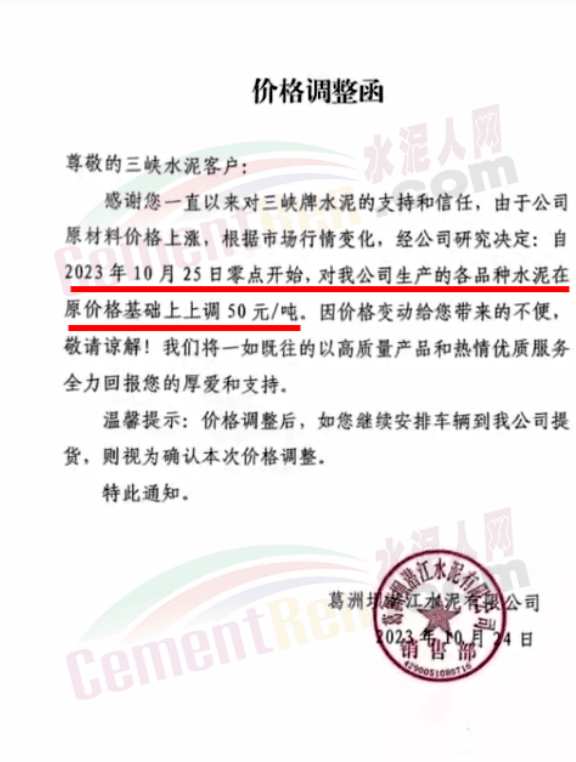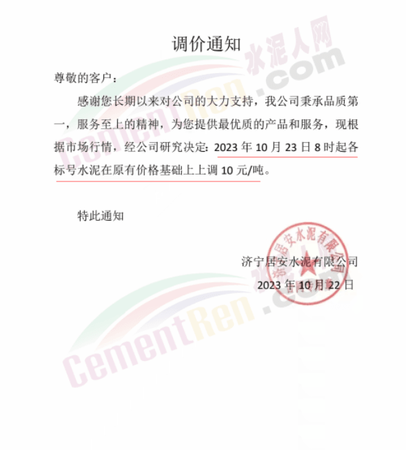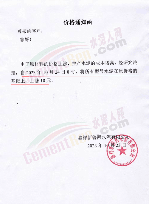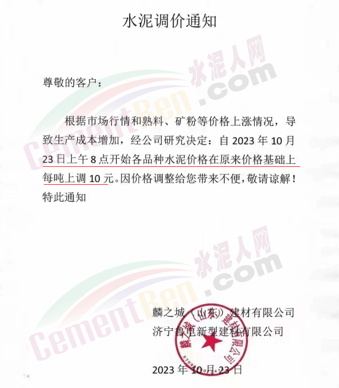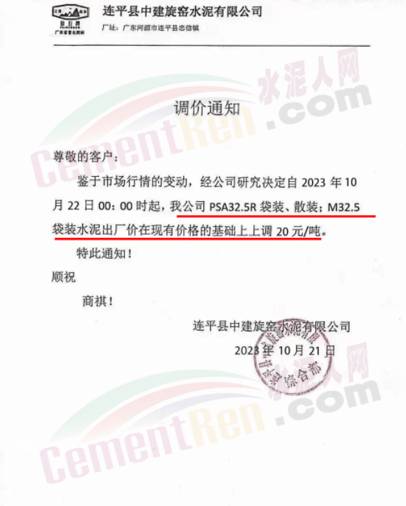 金隅冀東經貿公司通知,由于近期原材料持續上漲,生產能耗成本增加,導致公司生產成本增加。為維持企業正常生產經營,保障項目水泥供應,經研究決定自2023年10月23日8時起,將米脂冀東水泥有限公司、山西金隅冀東環??萍加邢薰景l往榆林市、延安市所有市場各品種水泥出廠價上調30元/噸。