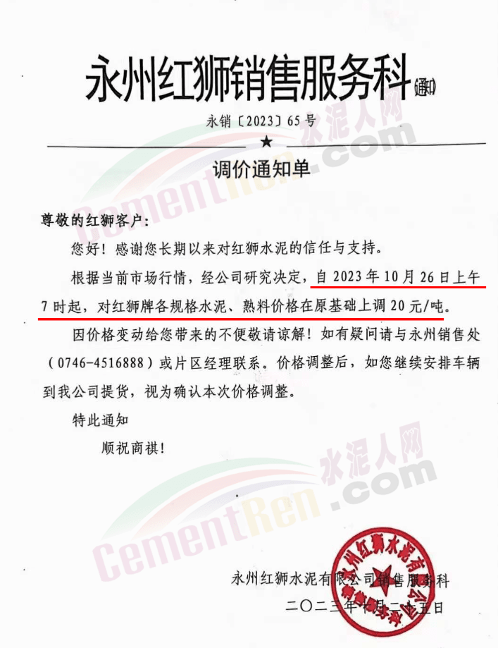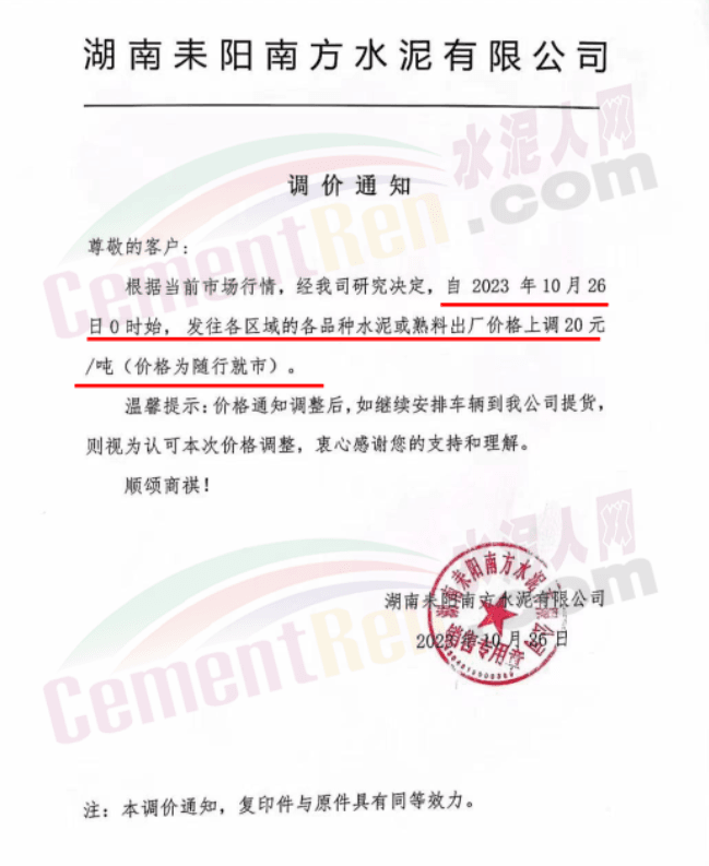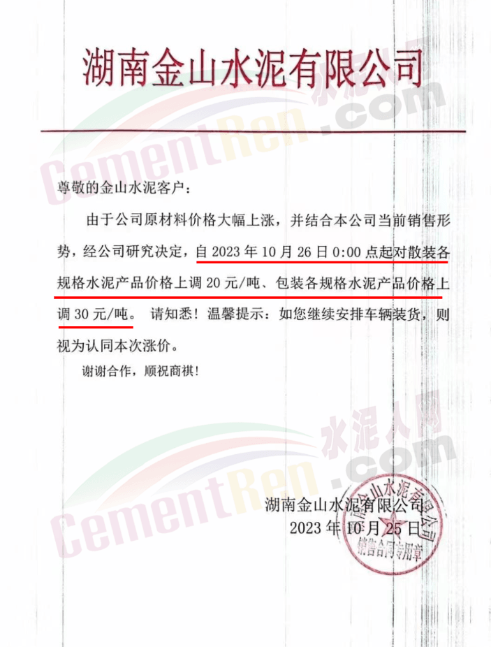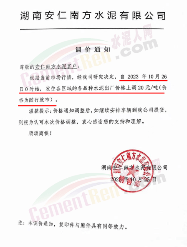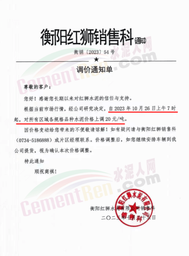 湖南耒陽南方、安仁南方、衡陽紅獅、永州紅獅、金山水泥等通知,自10月26日起上調水泥和熟料報價20元/噸。