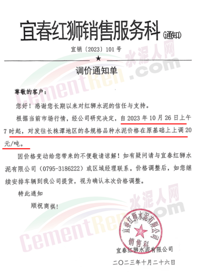 宜春紅獅通知,自10月26日起,對發往湖南長株潭地區的各規格品種水泥報價上調20元/噸。