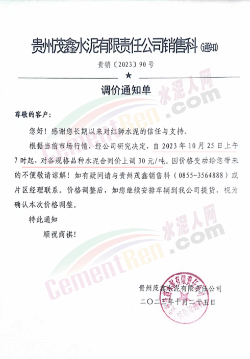 貴州銅仁、黔東南等區域茂鑫紅獅、黃平尖峰、銅仁西南、貴州東立等多家主要品牌水泥企業再次通知上調水泥報價30元/噸。企業調價通知稱,因近期原燃材料價格持續上漲,導致水泥生產成本大幅上升,經公司研究決定自10月25日起各品種水泥價格上調30元/噸。