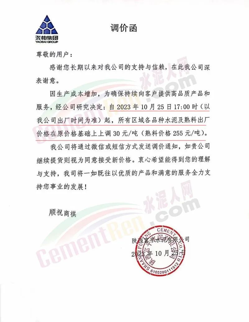 陜西銅川堯柏水泥、富平水泥、蒲城堯柏、實豐水泥、富平生態水泥、銅川聲威建材等主要品牌企業通知,因生產成本增加,自10月25日起各區域各品種水泥及熟料出廠價上調30元/噸(熟料價格255元/噸)。