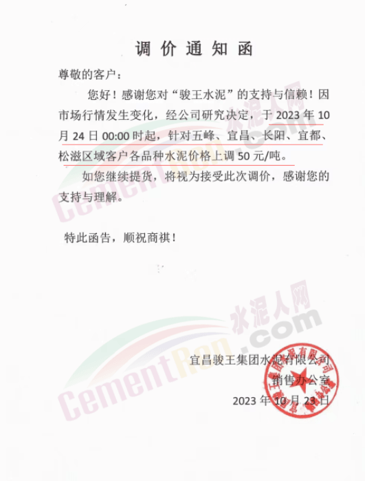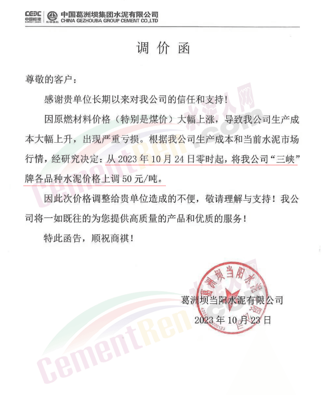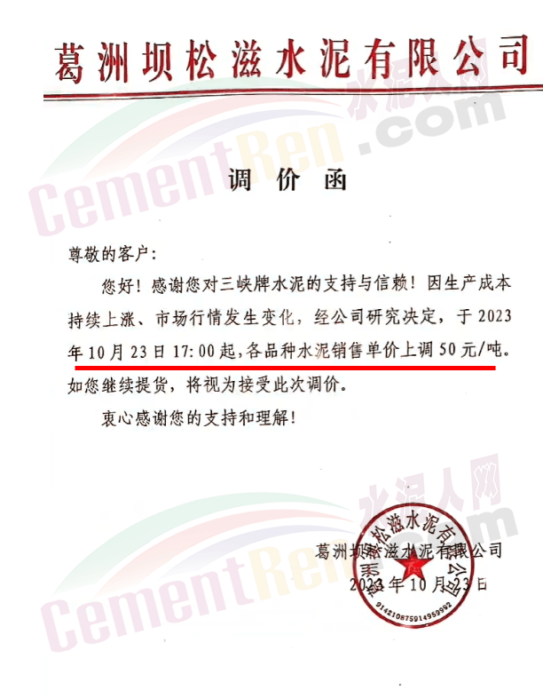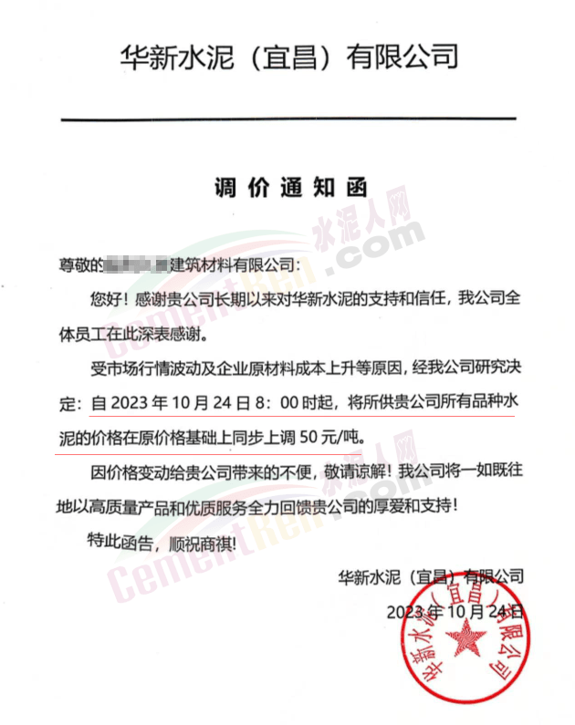 湖北華新水泥、葛洲壩水泥、駿王水泥等通知上調水泥報價50元/噸。