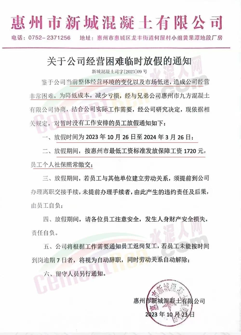 日前,廣東惠州市新城混凝土有限公司發布《關于公司經營困難臨時放假的通知》稱,鑒于公司當前整體經營環境的變化以及市場低迷,造成公司經營非常困難,為降低成本,減少虧損,經與兄弟公司惠州市九方混凝土有限公司協商,結合公司實際工作需要,對暫時沒有工作安排的員工從2023年10月26日至2024年3月26日放假。放假期間,按惠州市最低工資標準發放保障工資1720元,員工個人社保照常繳交。