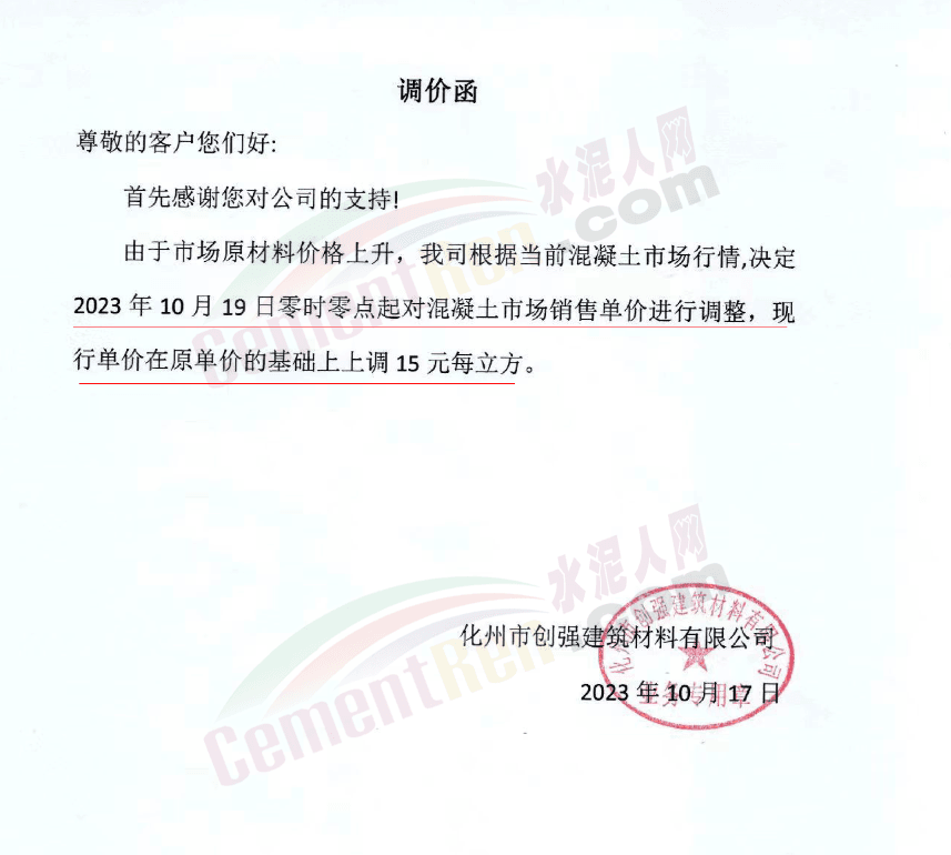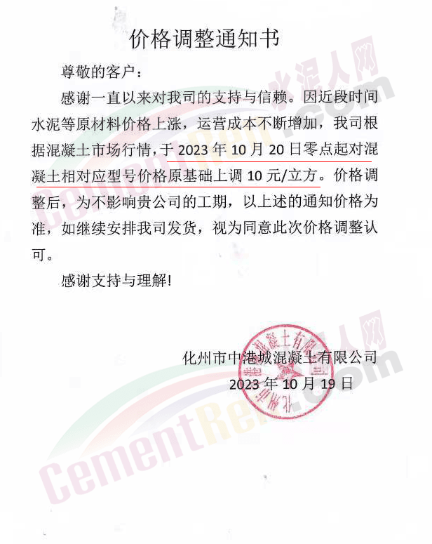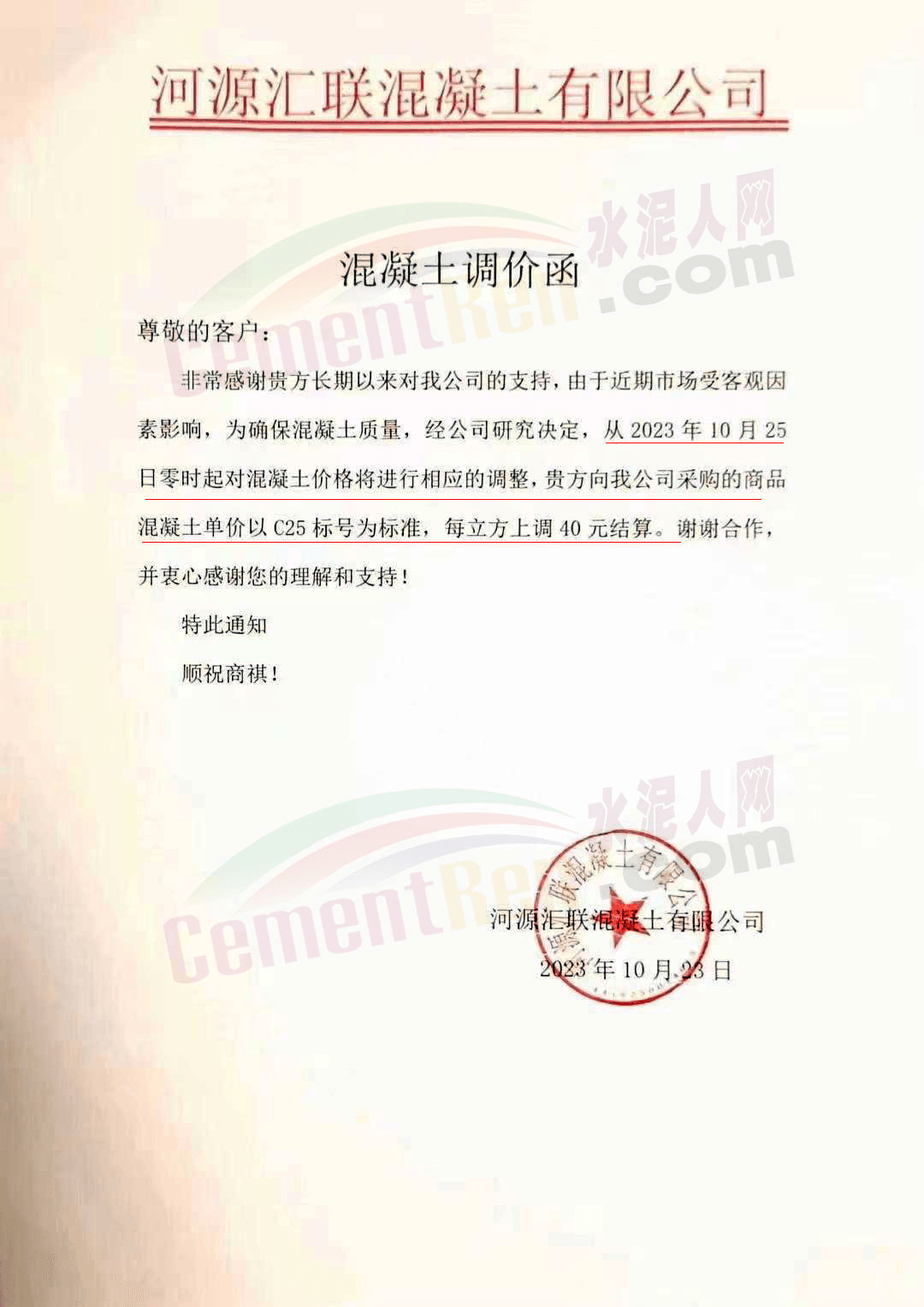 同期,河源一家商混企業一次性上調報價40元/噸。企業調價通知稱,由于近期市場受客觀因素影響,為確?;炷临|量,經公司研究決定從10月25日零時起上調混凝土報價。