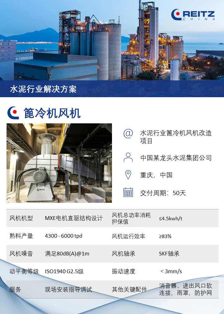 銳志風機憑借優秀的技術設計和精湛的制造工藝,幫助該客戶(中國北方最大的水泥生產商和供應商)在篦冷機風機改造項目中,順利實現: