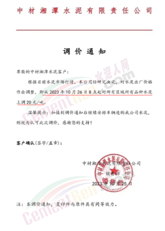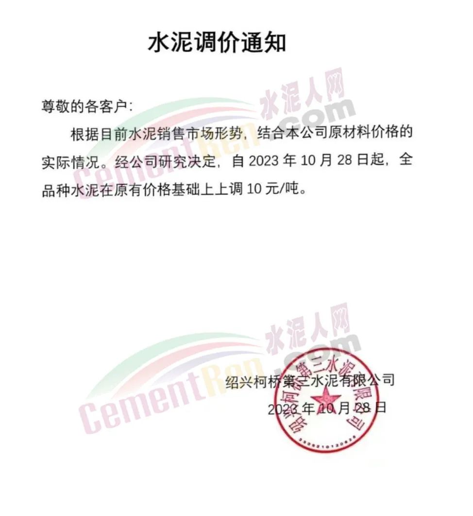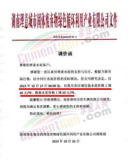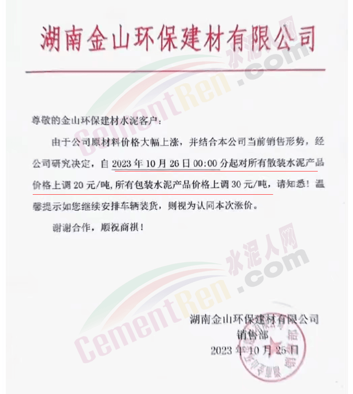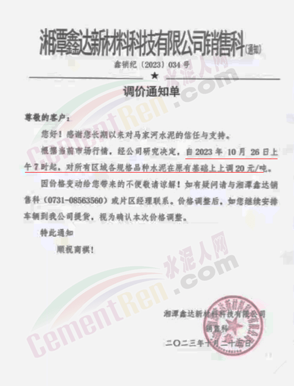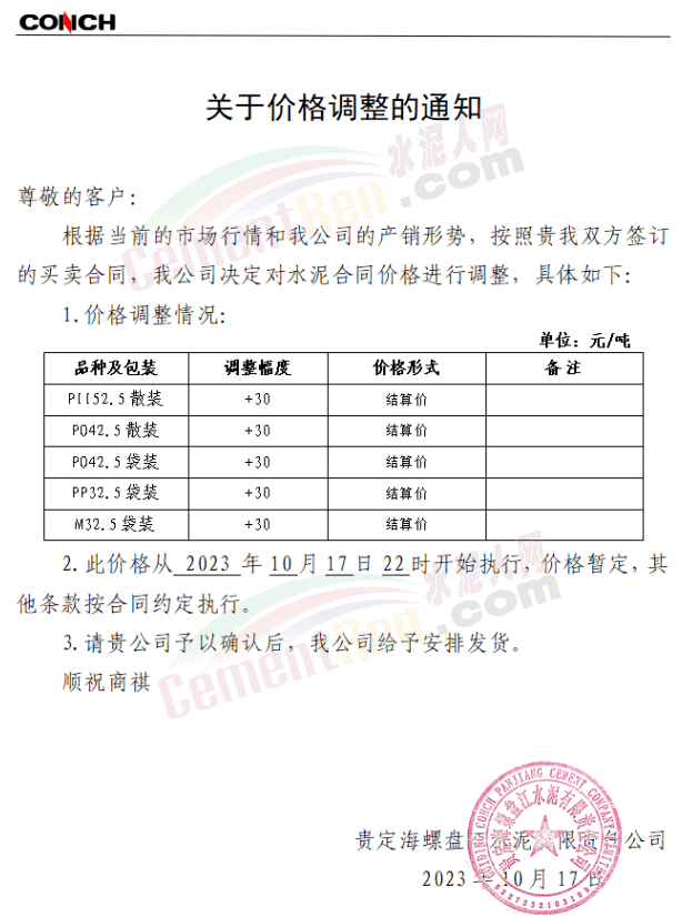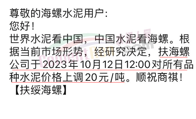 近來受原材料價格上漲和經濟政策的刺激,廣東、湖南、山西、陜西多地包括海螺水泥在內的多家品牌企業通知上調報價。廣東東莞鵬潤建材有限公司通知,根據目前的市場情況,從10月26日8時起公司供應的海螺全品項散裝水泥上調20元/噸。