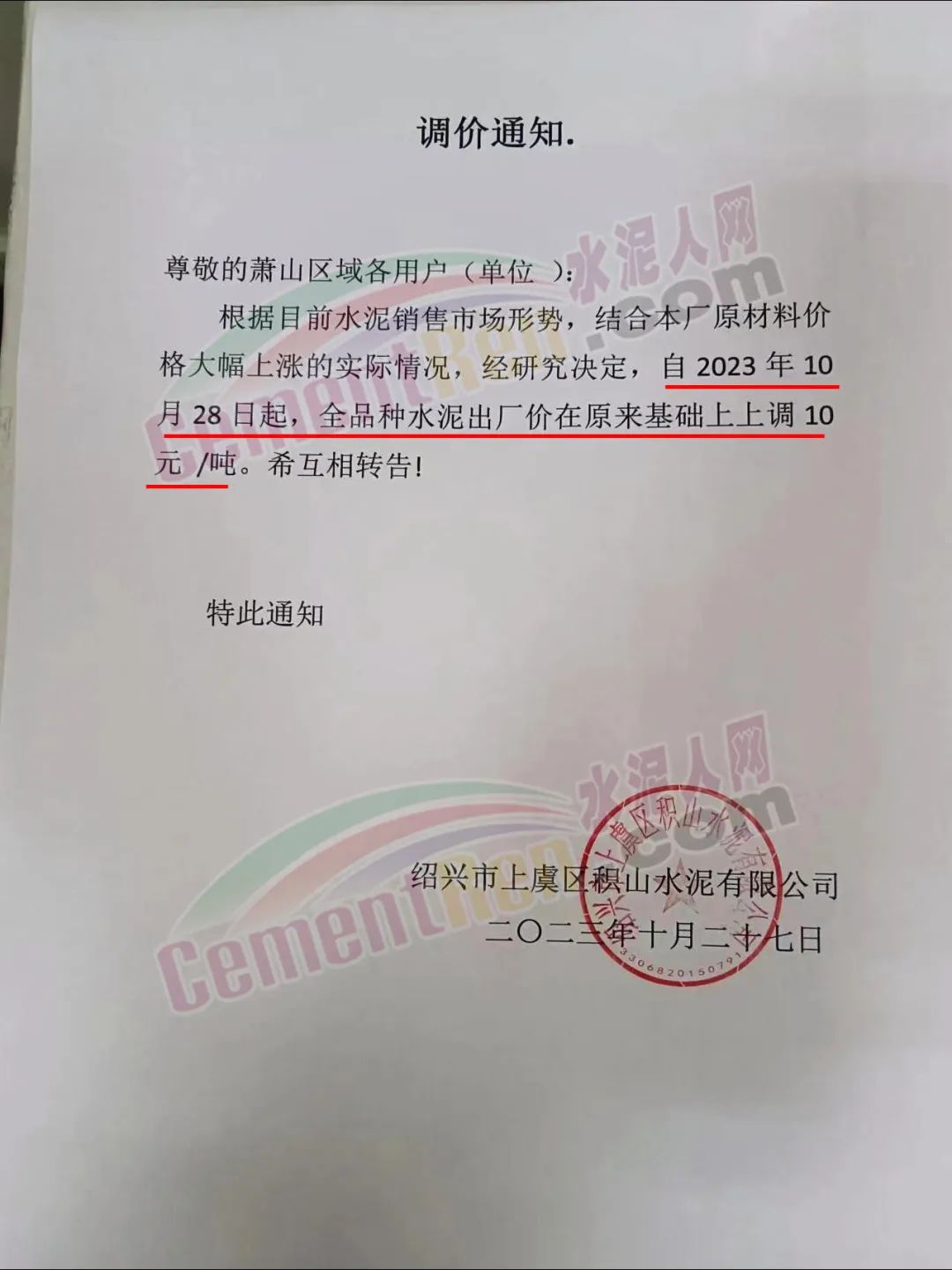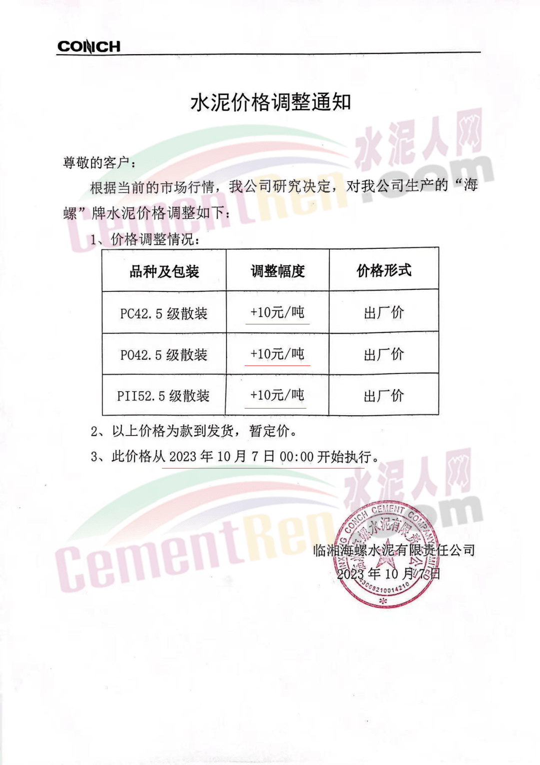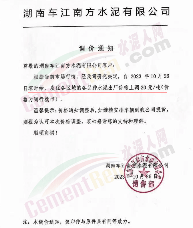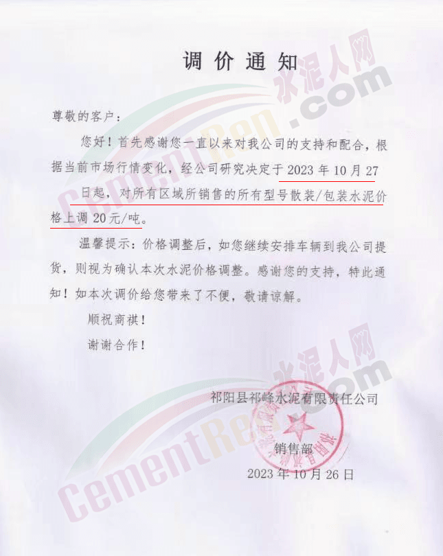 近來受原材料價格上漲和經濟政策的刺激,廣東、湖南、山西、陜西多地包括海螺水泥在內的多家品牌企業通知上調報價。廣東東莞鵬潤建材有限公司通知,根據目前的市場情況,從10月26日8時起公司供應的海螺全品項散裝水泥上調20元/噸。
