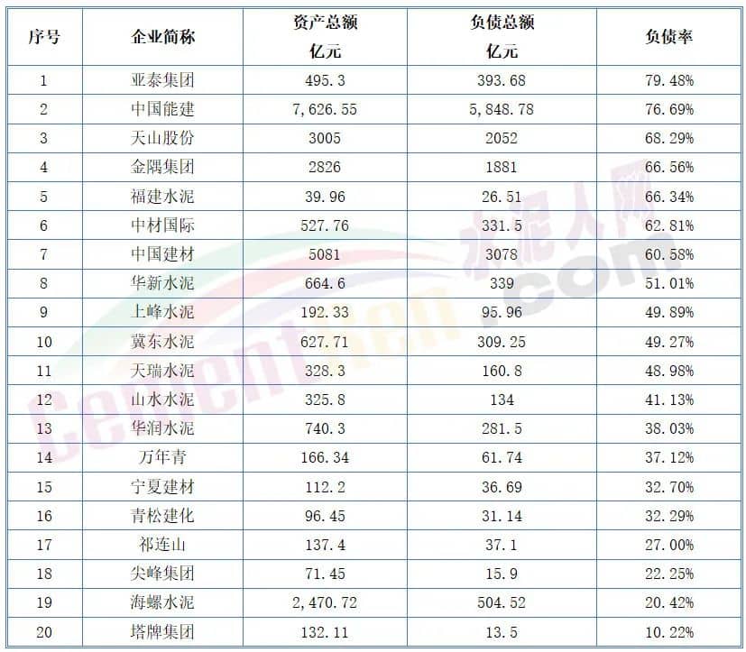 近期水泥行業各大上市公司先后發布了今年前三季度業績報告。其中亞泰集團、中國能建、天山股份、金隅集團、福建水泥、中材國際、中國建材等負債率超過50%。