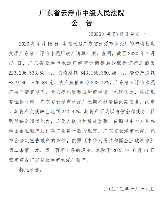 日前,廣東云浮市中級人民法院(以下簡稱“云浮市中院”)發布公告稱,截至2020年4月15日,廣東省云浮市水泥廠賬面資產總額2.23億元,負債總額5.43億元,凈資產總額-3.19億元,資產負債率為243.42%。因企業長期不能清償到期債務,資產不足以清償全部債務,且明顯缺乏清償能力,亦無人提出和解或重整,宣告破產。