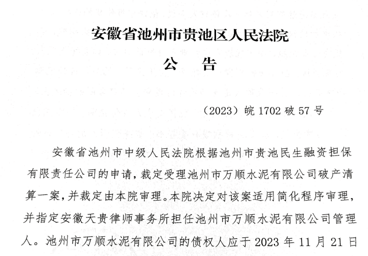 10月19日,安徽省池州市貴池區人民法院公告稱,安徽省池州市中級人民法院根據池州市貴池民生融資擔保有限責任公司的申請,裁定受理池州市萬順水泥有限公司破產清算一案。
