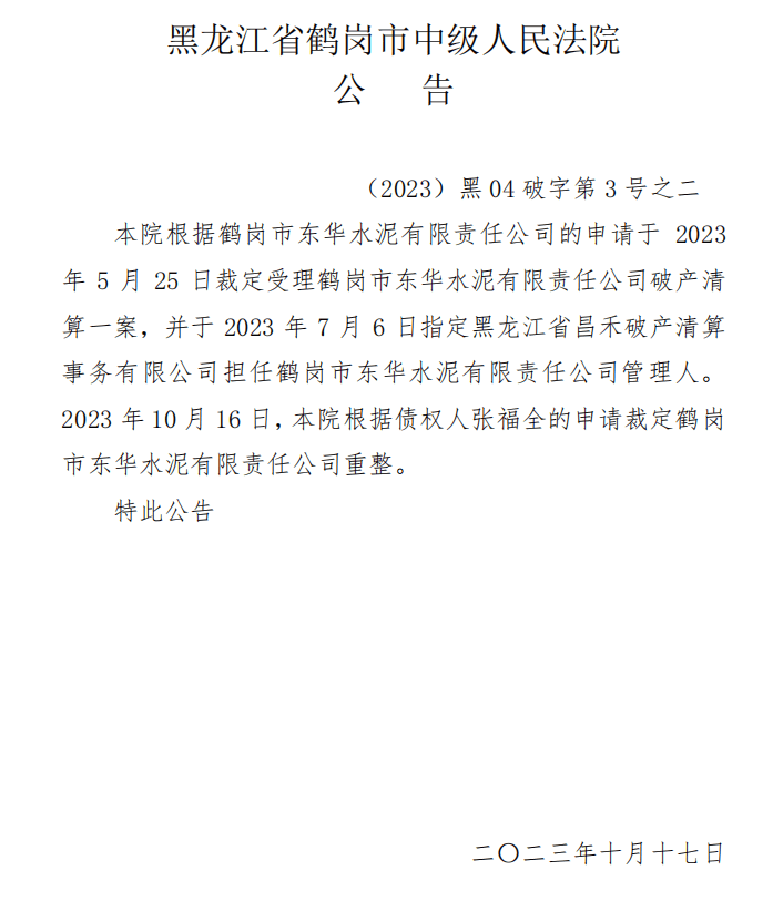 鶴崗市東華水泥有限責任公司被申請破產重整