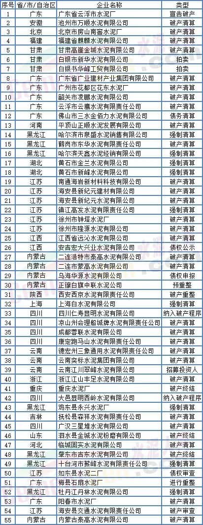 據水泥人網不完全統計,今年1~10月份已經有至少50多家水泥企業破產。