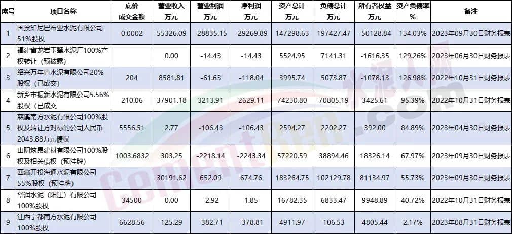 除已宣告破產的企業外,另有部分企業公開出讓股權。其披露信息顯示,資產負債率達100%以上。其中,國投印尼巴布亞水泥有限公司2023年09月30日財務報表顯示,資產負債率達134.03%。海螺水泥持股比例達49%,為其第二大股東。企業負債總計達19.74億,所有者權益為-5.01億,51%股權以2元底價出售。