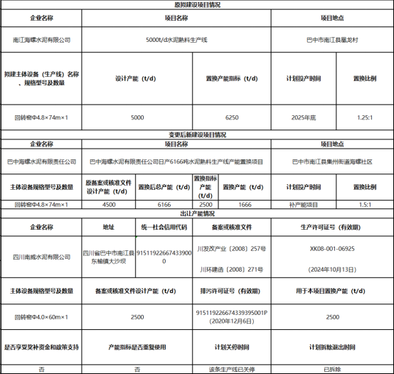 變更方案顯示:原擬建的南江海螺水泥有限公司5000t/d水泥熟料生產線項目變更為巴中海螺水泥有限責任公司日產6166噸水泥熟料生產線產能置換項目,置換比例由原來的1.25:1變為1.5:1。