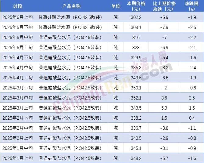 國家統計局數據從另一側面印證崩盤趨勢,2025年6月上旬,P.O42.5散裝水泥全國均價跌至302.2元/噸,較年初暴跌46元,實現連續12期下跌,潰敗已成燎原之勢。