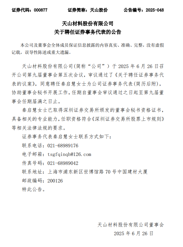 天山股份6月26日晚間發布公告稱,公司審議通過了《關于聘任證券事務代表的議案》,同意聘任秦啟慧女士為公司證券事務代表,協助董事會秘書開展工作。