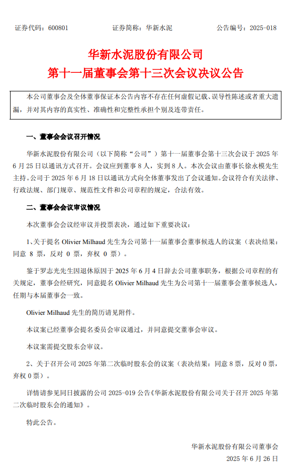 6月25日,華新水泥發布公告稱,經公司董事會會議審議并投票表決,選舉Olivier Milhaud為公司第十一屆董事會董事,任期與本屆董事會一致。根據公告,Olivier Milhaud,法國籍,1962年9月出生,巴黎埃塞克商學院碩士。