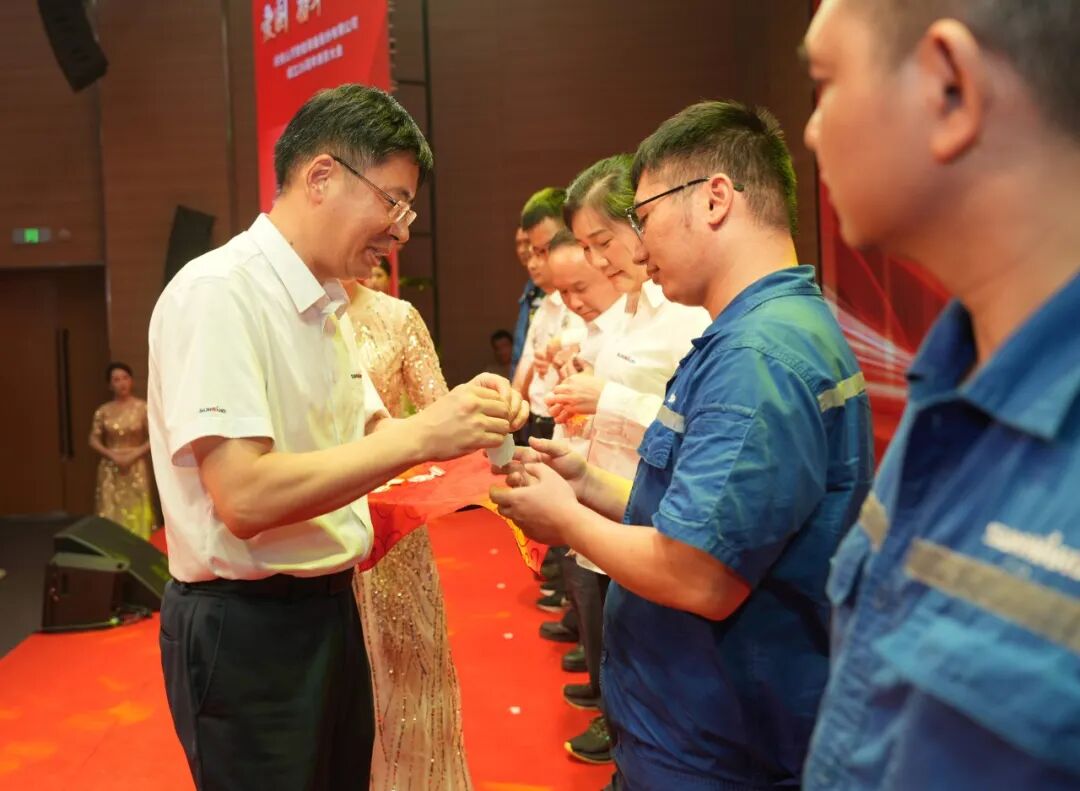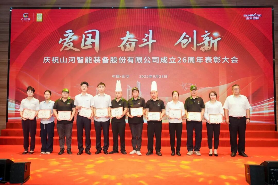 大會在莊嚴的《國歌》聲中拉開帷幕。付向東為新晉十年老員工授勛。夏志宏等領導為在慶祝山河智能成立26周年系列活動中獲獎的單位和個人頒獎。